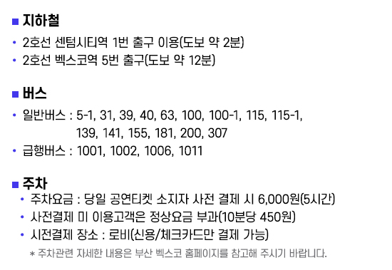 이번 미스터트롯3 전국투어 콘서트 부산은 벡스코 오디토리움에서 열립니다. 교통편 이용은 위와 같이 하시면 되는데 혼잡을 피하기 위해 되도록 대중교통을 이용하시는 것을 추천드립니다.